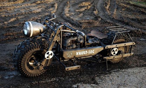 We saved this last one for you Nostradamus apocalypse believers and video game junkies. Believe it or not, a high school kid and his buddies hand built this motorcycle just about from scratch. Inspired by the Fallout 3 video game, the beefy bike is made from hand cut and welded tubular steel, and powered by a scrap engine with no transmission (low speeds only). Suspension? What suspension? The moto's Tumbler-like tires provide enough give.