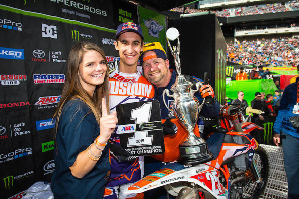 Fresh off his first 250 Supercross title, Musquin announced after the race that he had re-signed with the Red Bull KTM Factory Team for two more years. Even more exciting to the masses, is that Musquin will be racing in the 450 Supercross and 450 Motocross Championships starting in 2016.