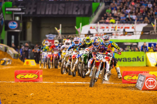 The AMA decided to do a staggered start since more than 3 laps had been completed. Musquin led the way off the staggered start and quickly got out to his top spot once again. This time he again pulled on the field and went on to collect his first win of the season. His win at the opening round will give him the red-plate heading to the next event.