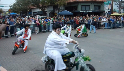 No, this isn’t some conspiracy detailing Elvis’s triumphant return to life after chillin’ with JFK in that circus trope. This is just a group of well-intentioned men hoping to live a bit like the King himself—on minibikes and in a parade.