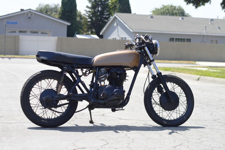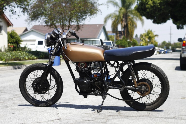 Starting life as a 1976 Honda CJ360T, it has since lost its fenders, tail section, mirrors, handlebars and factory paint.