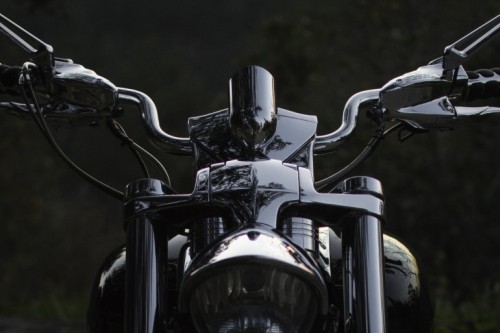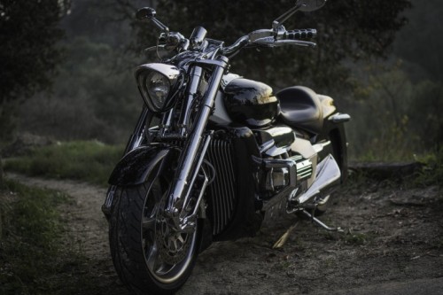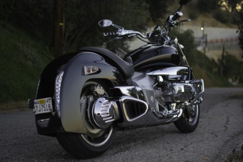 Pointing the front wheel toward the Hollywood hills, I snaked up a twisty canyon. Mindful of the low clearance, I was surprised to find that the Rune actually handled pretty well through the corners. Sure, there was no knee dragging, or crossed-up supermoto moves to be had aboard the super tanker-cruiser, but steering response was predictable and the bike felt much lighter then it was. The wind felt different against my body. Rather than trying to lean against the force, or tuck under it, I sat back and let my body scoop it up. The engine rumble also had a hypnotic effect. Getting on the gas hard off the line laid a smoking strip of black rubber on the pavement.