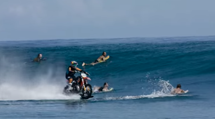 In order to put on this incredible show, his KTM was equipped with a paddle tire on the rear and skis on the side of both wheels!