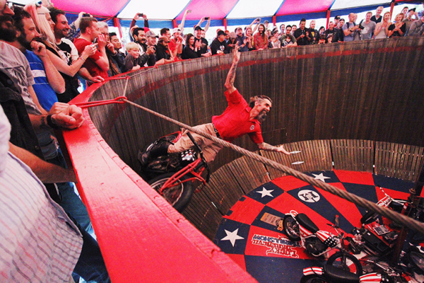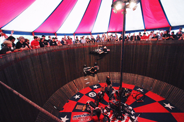 The doors opened at 6 o'clock Friday night, and from that moment on the free show was filled with people of all ages. Attendees spent their time drooling over custom bikes, enjoying drinks, art work, and the American Wall Of Death, which happened every hour until closing time Sunday night.