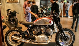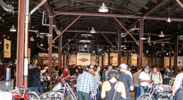 The motorcycle show featured 110 bikes ranging from a 1911 Flying Merkel to several fresh-paint customs from across the US, plus Colombia and Mexico. It was a representative sampling of what’s happening in the Alt.Moto scene today, with a café racer bias, although plenty of choppers, vintage, and just plain oddballs were parked inside, with enough space that everyone could see everything, even when the joint was busting at the seams on Friday and Saturday evenings. The Handbuilt philosophy is self-explanatory; a generation of screen-gazers needs a kick in the pants, and a wrench in the hand. Because cussing at an old motorcycle, or any Real-Life hobby, builds character, as the Bearded Ones have discovered (okay, some of them). Art counts too, so the walls held an exhibition of painters, graphic designers, and photographers (which in full disclosure included yours truly, as half of MotoTintype, with Susan McLaughlin), and the Oil&Ink Expo.