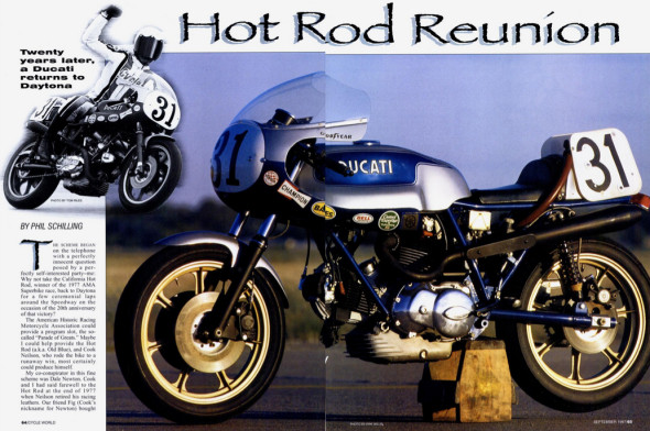 The last time the bike ever ran at the track was documented in the September 1997 issue of Cycle World. In “Hot Rod Reunion” by Phil Schilling and “Ode to Old Blue” by Cook Neilson, the gents recounted their trip back to Daytona to run the bike and hear its great booms echo off the banking 20 years after running in anger. Read the full feature in a free preview of CW’s COVER TO COVER archive service.