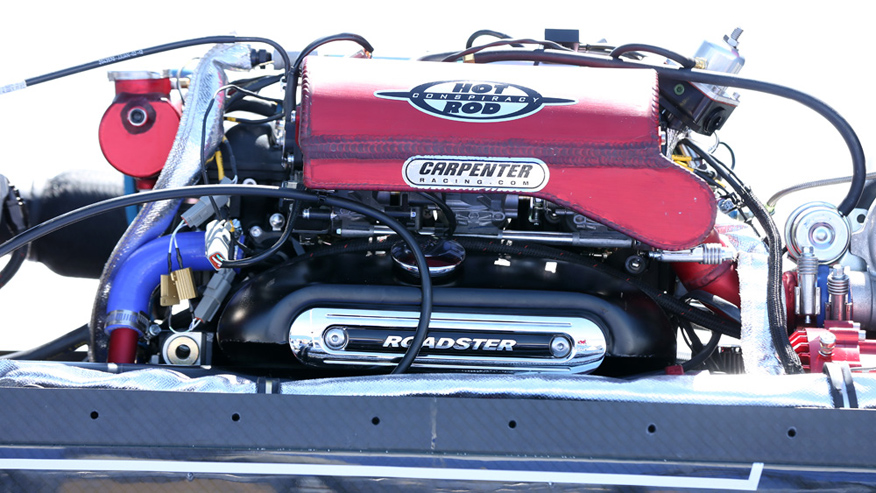 The motorcycle is a 25.5 foot long made of carbon Kevlar, fully tuned and turbocharged by Carpenter Racing to deliver two massive 1.5 L Triumph Rocket III 3-cylinders engines, putting out combined 1,000 hp running on methanol. The bike has two swingarm-suspended wheels reinforced by Goodyear Land Speed Special tires and retractable stabilizers to assure a steady start and stop.
