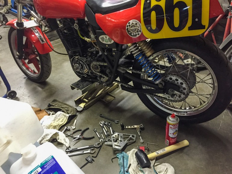 As I pushed the bike in to the corner of the shop that would be mine for the coming season, I started a mental list of things that would need to be done if we were going to be ready: Get the bike running, which was vague since I'm not very good at wrenching on motorcycles. Who knew what gremlins lie hidden under the fairing of the compact track-machine? Get proper racing gear, I already had a set of Rev'it Hunter leathers, but still needed race boots, gloves and a helmet. I needed to register for races, join AHRMA and plan a season, all on a practically non existent budget, and...why was the bike so hard to push? The tires were nearly completely flat after sitting for so long. Okay, number one task: put air in tires. I would need a new set of those as well. While they had never been ridden on—still sprouting with the little rubber nipples—they were ten years old. No sense in learning the hard way if they were any good. I would need tire warmers too. Race bikes don't have kickstands it turns out so Ralph loaned me a lift to use in the shop, I would need one of those as well. I lost track of my list and I hadn't even started.