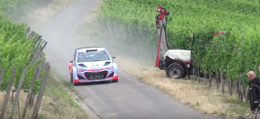 Out of nowhere, in the middle of the rally, a tractor came out on the road without any warning and almost crashed with the Hyundai i20 racing car!