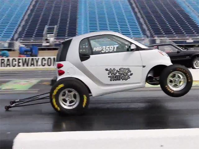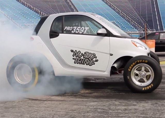 Cute little city car will monster a Hellcat in a straight line. You’ll have to ask Mark Cryer why someone would do this to a Smart car, but after watching the video you’ll be glad he did. Dubbed the “Nu Big Thing,” the Smart comes powered by a 9.0-liter Big-Block Chevy engine rated at 725 horsepower. The phenomenal little car has held the title of world’s fastest smart car for a while now, and with new larger and wider tires to help reduce wheelstanding, the Smart was able to put down its fastest quarter-mile run yet, with a time of 10.26 seconds at 130.83 mph. Take that, Hellcat.With a few more adjustments, the plan is to break into the nines later this year.