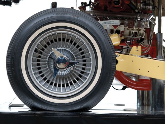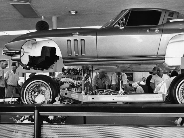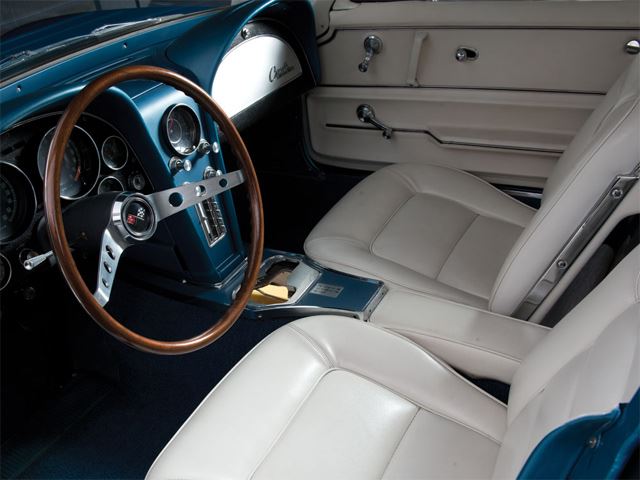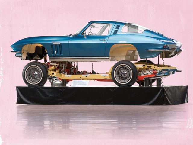 It may have the familiar 327 cu. in. V8 engine and four-speed transmission from any 1965 Chevrolet Corvette Stingray. But this one has one very distinct feature unlike any other: it sits on top of a demonstration stand. The reason was for GM marketing purposes to show off the then new C2 Corvette on the auto show circuit, such as Motorama. However, this Corvette actually began life as a road-ready, early production example painted Le Mans Blue with a white interior.
